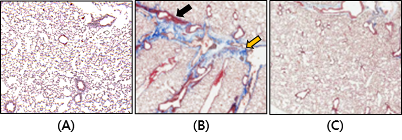 (C)Lung fibrosis mice model: The disease model shows that the bronchial cells get thicken abnormally (black arrow), and excessive collagen are secreted by fibroblasts (yellow arrow), causing fibrosis in lung.