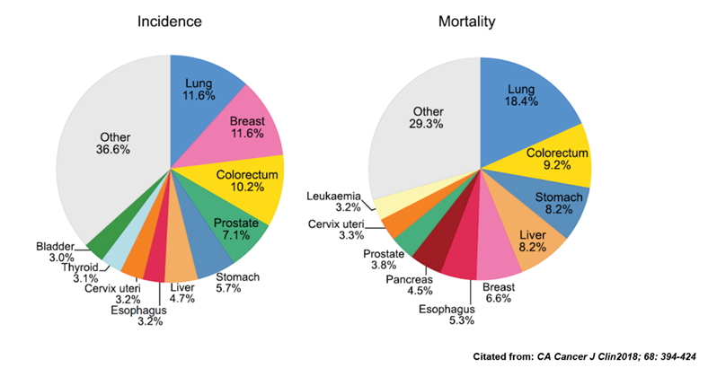 According to the World Health Organization (WHO) and Global Cancer Statistics 2018, cancer is the second leading cause of death in the world. Furthermore, 18 million new cases of cancer patients were diagnosed in 2018 and 9.6 million died of cancers especially in Lung (18.4%), colorectal (9.2%), stomach (8.2) and liver (8.2%) cancer. Moreover, according the data from Ministry of Health and Welfare in Taiwan, cancer is the first cause of death in Taiwan in 2017 and the top three indications are lung, liver and colorectal cancer.