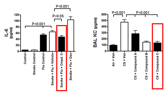 (B) MG-S-2525 (compound C) decreases the expression of IL-6 and IL-8 efficiently in the mice models which was induced by acute inflammation. (*KC is the homologue of IL-8 in murine model)