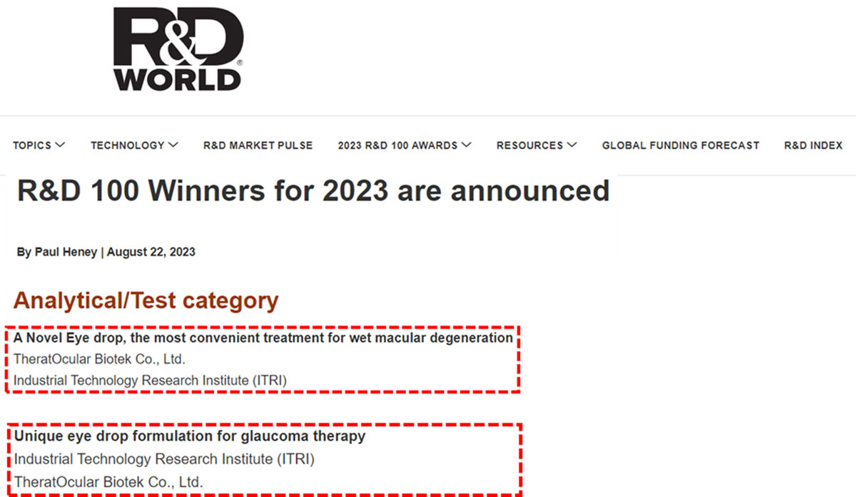 《R&D World》magazine has announced the winners of the 2023 R&D 100 awards, the 61-years world-renowned science and innovation competition. TO-O-1001 is a best-in-class ROCKi eye drops for the glaucoma treatment. It has a significant effect of lowering IOP with low side effects. TO-O-1002 has repeatedly won international awards, which shows that its novelty has been recognized by international reviewers, and it will provide a more friendly way for the treatment of nAMD in the future.